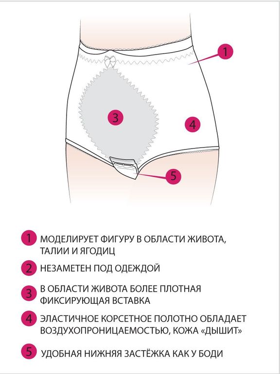 Белье ФЭСТ рекомендовано российским обществом акушеров-гинеклогов. Моделирует фигуру в области живота, талии и ягодиц. Бандаж незаметен под одеждой. Застежка снизу как у боди. Воздухопроницаемое корсетное полотно.
